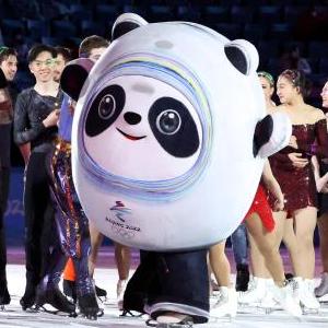 2月20日,选手们在表演滑结束后与“冰墩墩”互动。当日,北京2022年冬奥会花样滑冰表演滑在首都体育馆举行。新华社记者 张玉薇 摄