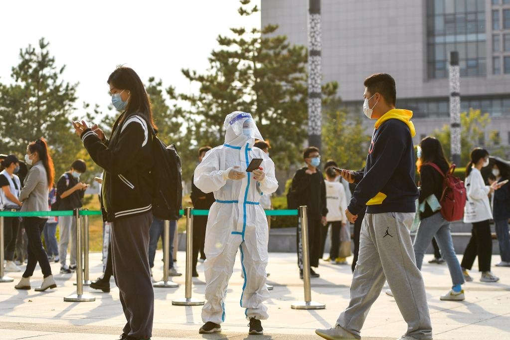 10月2日,在吉林省长春市一处便民核酸检测点,工作人员为前来进行核酸检测的市民扫码登记。新华社记者 许畅 摄
