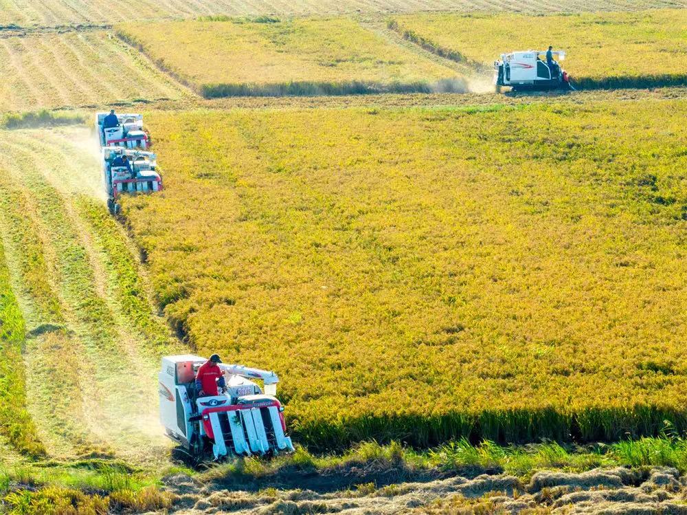 “预计这片稻田产量能达到每亩550公斤。”童氏家庭农场主童开化表示,他从2016年开始尝试水稻耕种、植保、收割全程机械化作业。而全机械化收割机的使用,让切割、脱粒、粉碎稻秆等工序一气呵成,200多亩水稻在5天内就能收割完毕,极大地提高了收割效率。