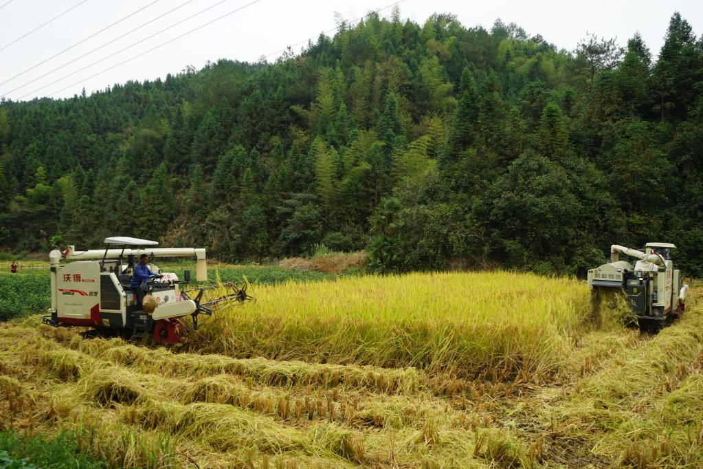 在浙江多地秋收现场,还能看到各类农机装备“大显身手”。在浙江省衢州市开化县桐村镇杜坑村,童氏家庭农场的200多亩水稻一片金黄,两台收割机穿梭其间,饱满的稻穗被“收入囊中”。