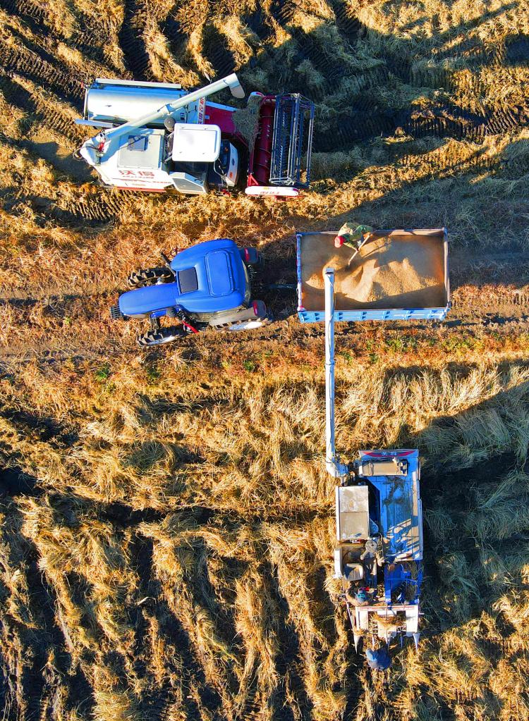 10月18日,在辽宁沈阳市沈北新区兴隆台镇青年农场,农民把机械化收割下来的水稻装车(无人机照片)。 新华社记者 杨青 摄