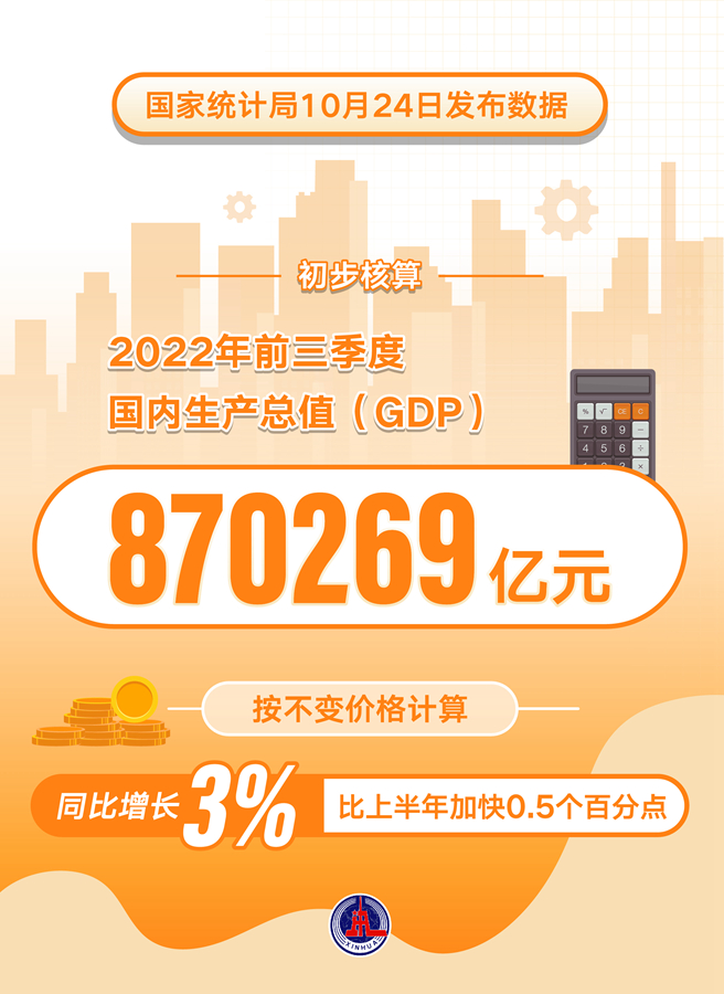 新华社北京10月24日电(记者魏玉坤、严赋憬)国家统计局24日发布数据,初步核算,前三季度国内生产总值(GDP)870269亿元,按不变价格计算,同比增长3%,比上半年加快0.5个百分点。