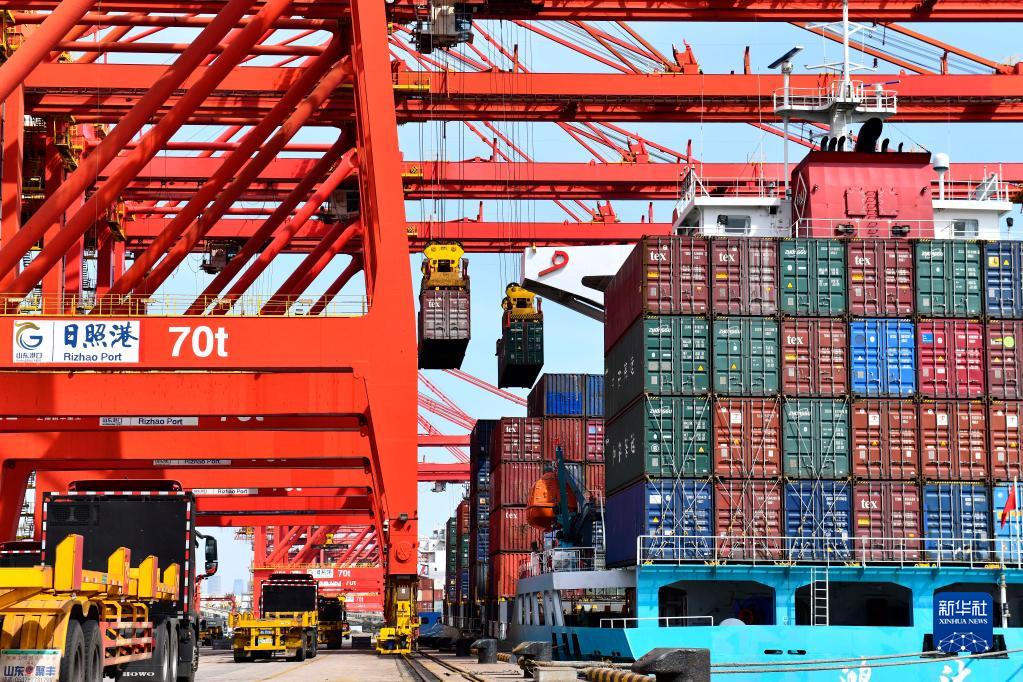 卡车在山东日照港集装箱码头装运集装箱(3月28日摄)。新华社记者 郭绪雷 摄