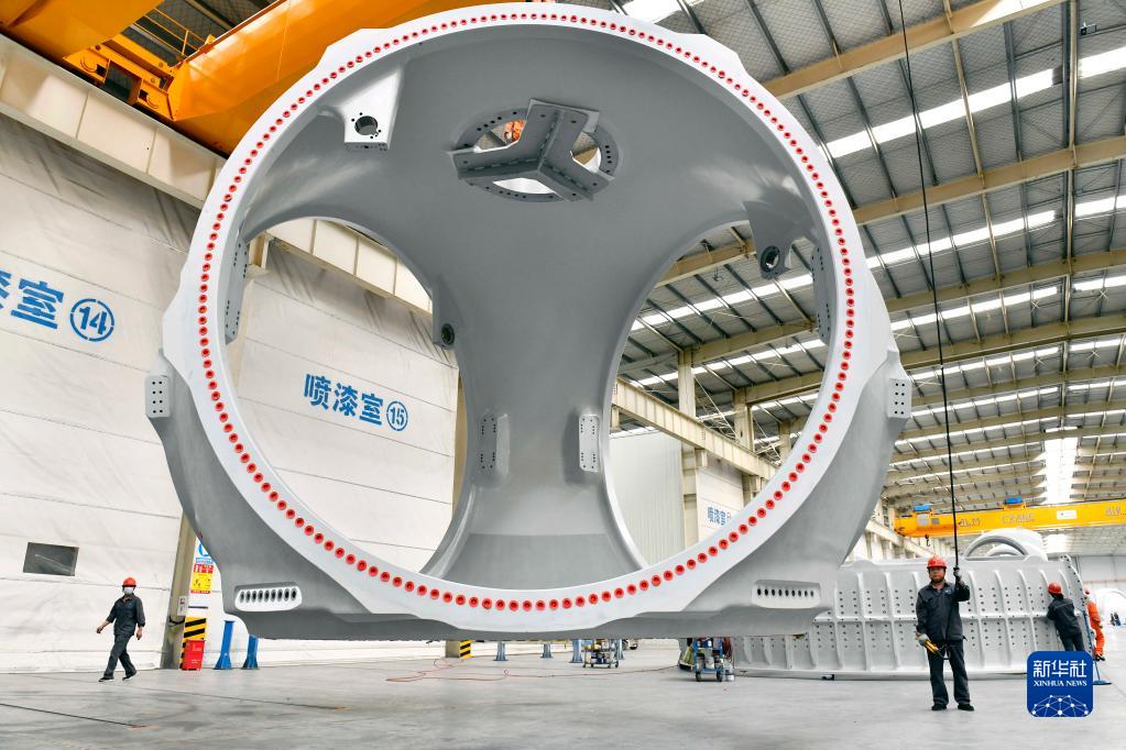 工作人员在山东省惠民县风电装备产业基地一涂装车间内作业(6月7日摄)。新华社记者 郭绪雷 摄