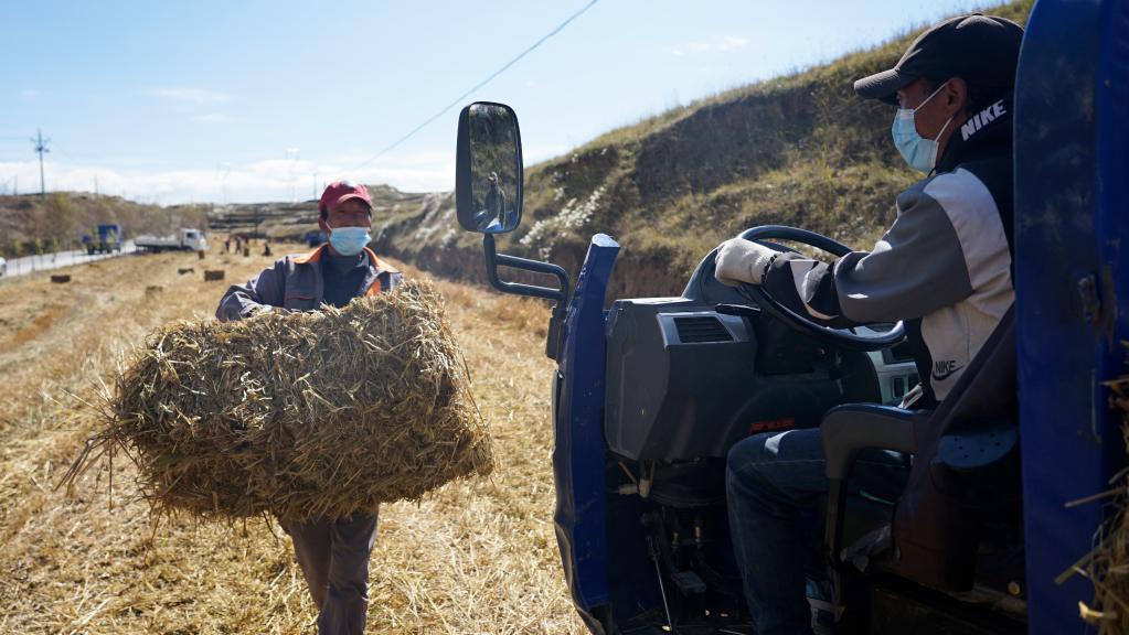 10月19日,日秀玛村村民将刚打捆好的饲草装车。新华社记者 陈杰 摄