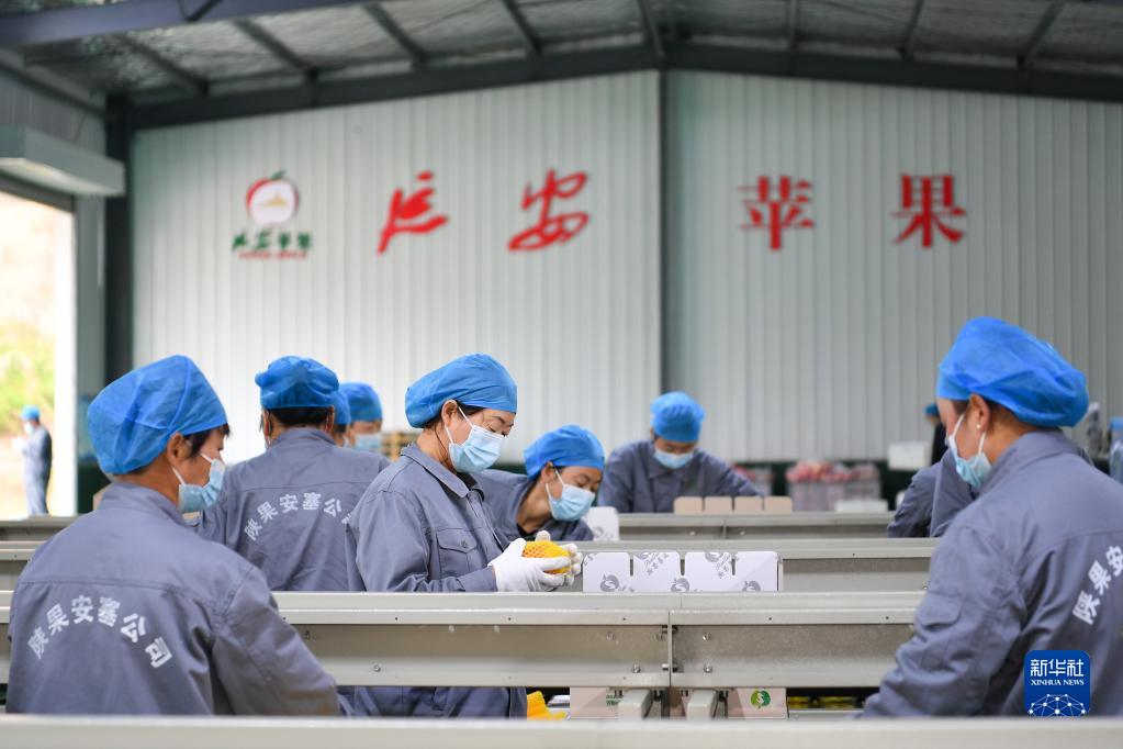 9月20日,陕西延安市洛川县一家果业公司的工作人员在包装线上忙碌。新华社记者 邵瑞 摄