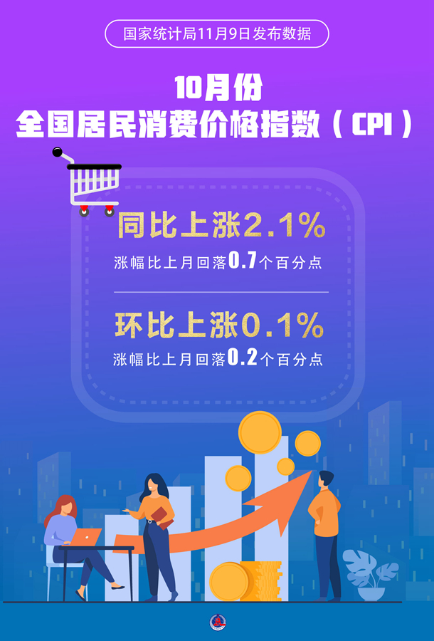 新华社北京11月9日电(记者魏玉坤)国家统计局9日发布数据,10月份,全国居民消费价格指数(CPI)同比上涨2.1%,涨幅比上月回落0.7个百分点;环比上涨0.1%,涨幅比上月回落0.2个百分点。