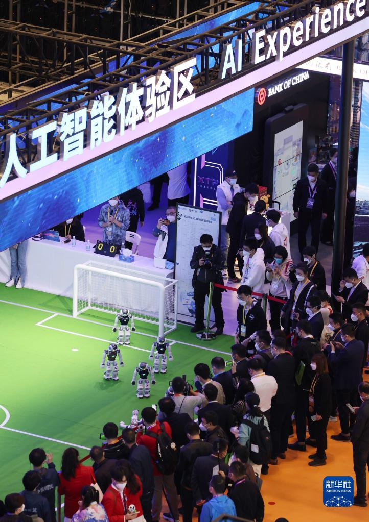 2022年11月5日,参观者在第五届进博会人工智能专区观看机器人表演。新华社记者 金立旺 摄