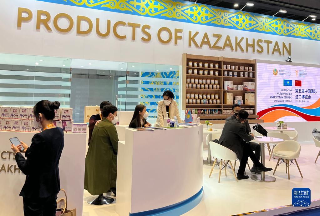 这是2022年11月6日在第五届进博会上拍摄的哈萨克斯坦产品展区。新华社记者 郑冬睿 摄