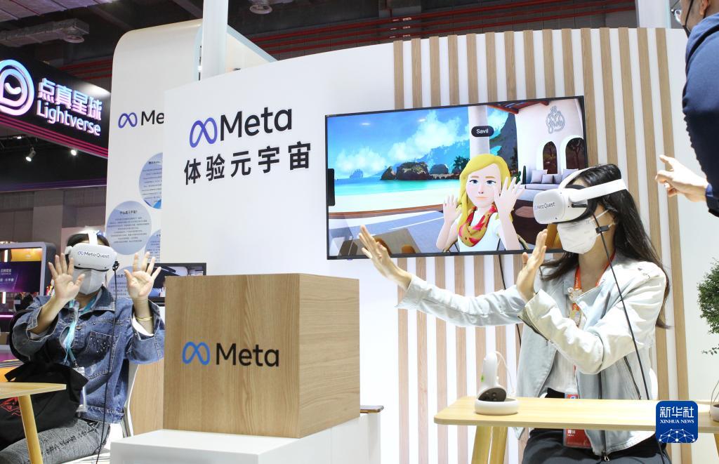 2022年11月7日,在第五届进博会技术装备展区的人工智能专区,体验者借助VR头戴设备感受在虚拟工作空间“隔空击掌”。新华社记者 侯俊 摄
