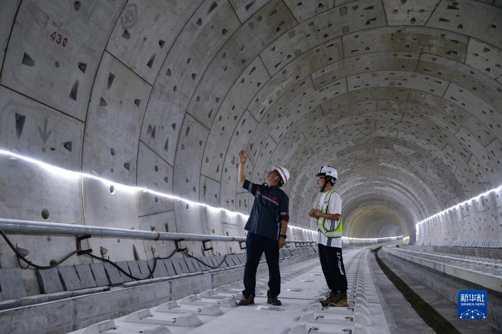 5月9日,印尼中国高速铁路有限公司财务董事张超(左)和同事在印度尼西亚雅万高铁1号隧道内查看施工情况。新华社记者 徐钦 摄