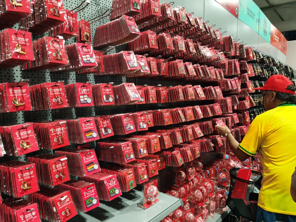 货架旁,球迷、游客、当地民众正在认真挑选,各类商品琳琅满目:衣服、帽子、足球、包、围巾、手环、水杯、徽章、挂摆件、吉祥物、文具……