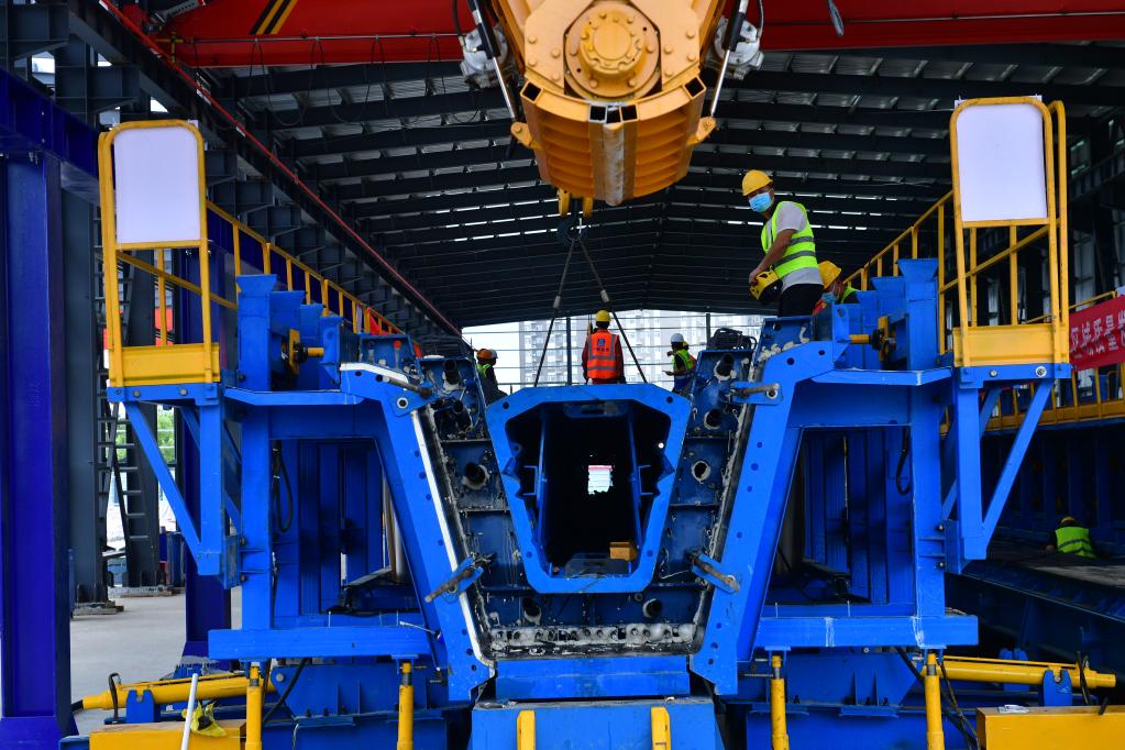 走进构件场,机器轰鸣阵阵,钢筋加工场、混凝土搅拌站、预制箱梁生产线等区域映入眼帘,几名工人坐在操控间。预制梁就像一座“小型飞船”,在工人的操控下,稳稳地落到设备架上。