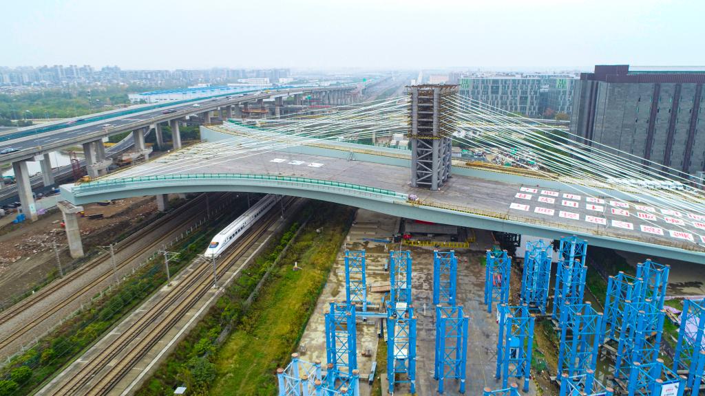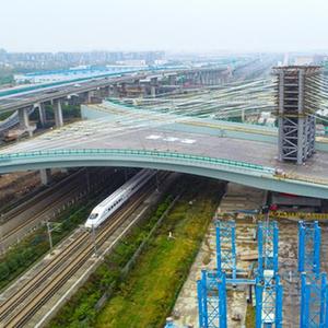 该转体桥总重1.58万吨,采用整幅转体方案。为不影响附近铁路线的正常运行,该项目利用210分钟的铁路夜间停运“天窗点”施工。该桥体的特殊性在于庞大且不规则,桥面最大纵坡6.04%,桥梁两端最大高差达12米,重心偏离桥墩中心8.7米。“转身”的难度在于,在106.3度的大角度转动且跨越多股道铁路线的过程中,需保持好桥面稳定与平衡控制,为世界级施工难题。