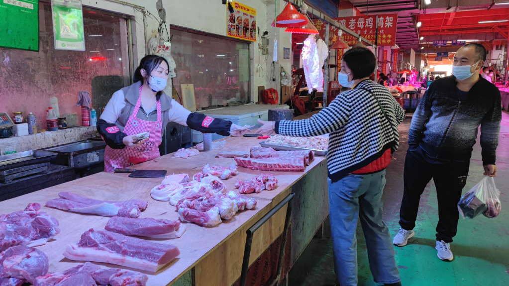 消费者在四川省三台县的农贸市场买猪肉。新华社记者袁波 摄