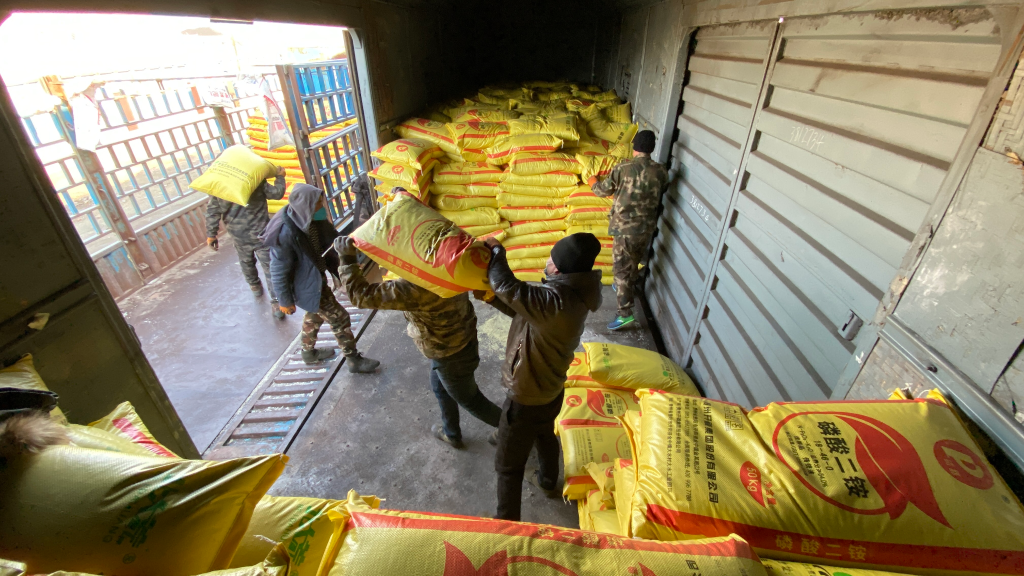 北大荒集团二龙山农场有限公司工作人员正在为新运进的化肥卸车。(受访者供图)