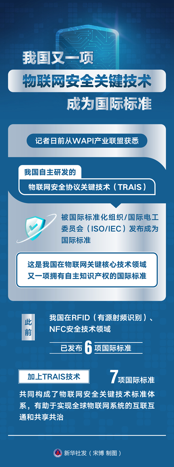 新华社北京12月14日电(记者刘羽佳)记者日前从WAPI产业联盟获悉,我国自主研发的物联网安全协议关键技术(TRAIS)被国际标准化组织/国际电工委员会(ISO/IEC)发布成为国际标准。这是我国在物联网关键核心技术领域又一项拥有自主知识产权的国际标准。