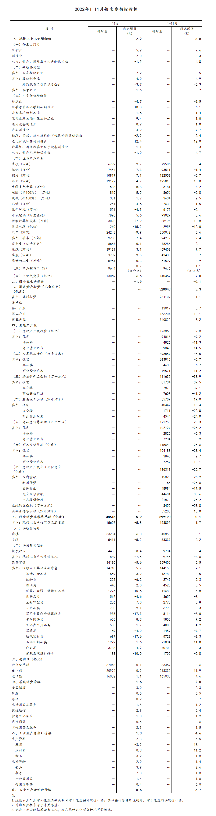 11月份,面对更趋复杂严峻的国际环境和国内疫情多发广发等多重挑战,在以习近平同志为核心的党中央坚强领导下,各地区各部门认真学习贯彻落实党的二十大精神,坚决贯彻落实党中央、国务院决策部署,高效统筹疫情防控和经济社会发展,切实抓好稳经济各项政策举措落实,国民经济保持恢复态势,投资规模继续扩大,市场价格总体平稳,新动能持续成长,民生保障有力有效,经济社会大局稳定。