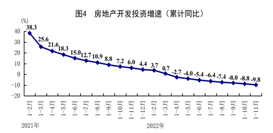 1-11月份,全国固定资产投资(不含农户)520043亿元,同比增长5.3%。分领域看,基础设施投资同比增长8.9%,制造业投资增长9.3%,房地产开发投资下降9.8%。全国商品房销售面积121250万平方米,同比下降23.3%;商品房销售额118648亿元,下降26.6%。分产业看,第一产业投资同比增长0.7%,第二产业投资增长10.1%,第三产业投资增长3.2%。民间投资增长1.1%。高技术产业投资增长19.9%,其中高技术制造业和高技术服务业投资分别增长23.0%、13.2%。高技术制造业中,医疗仪器设备及仪器仪表制造业、电子及通信设备制造业投资分别增长28.3%、28.2%;高技术服务业中,科技成果转化服务业、电子商务服务业、研发设计服务业投资分别增长26.1%、24.4%、21.2%。社会领域投资增长12.5%,其中卫生、教育投资分别增长29.3%、7.5%。11月份,固定资产投资(不含农户)环比下降0.87%。