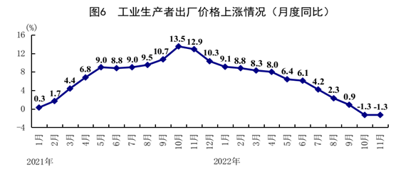 1-11月份,全国工业生产者出厂价格、工业生产者购进价格同比分别上涨4.6%、6.7%。11月份,全国工业生产者出厂价格同比下降1.3%,环比上涨0.1%;工业生产者购进价格同比下降0.6%,环比持平。