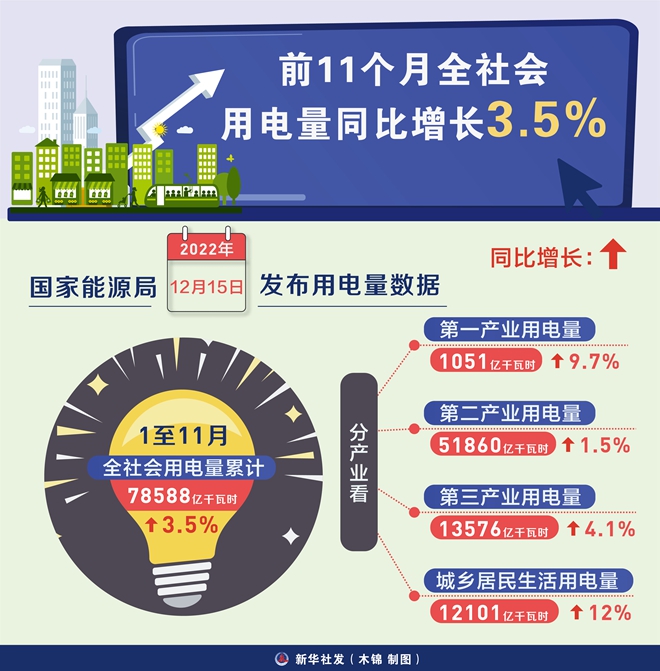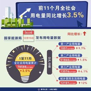 新华社北京12月15日电(记者戴小河)国家能源局15日发布用电量数据,1至11月全社会用电量累计78588亿千瓦时,同比增长3.5%。