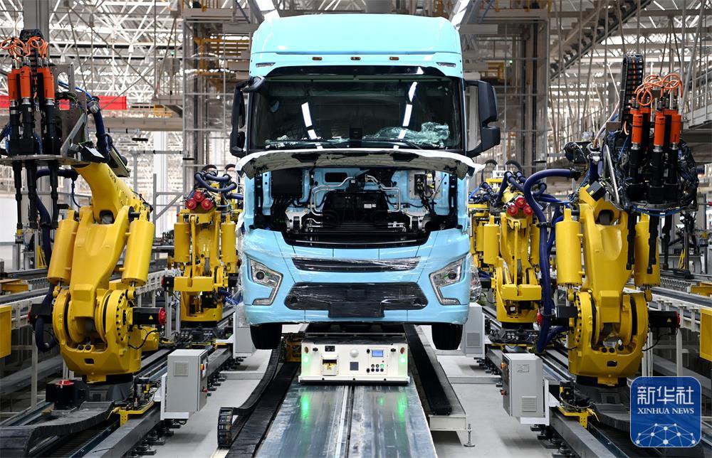 在陕汽重卡扩能项目现场,一辆重卡在汽车总装生产线轮胎自动化装配拧紧无人工作站进行装配(9月27日摄)。新华社记者 刘潇 摄