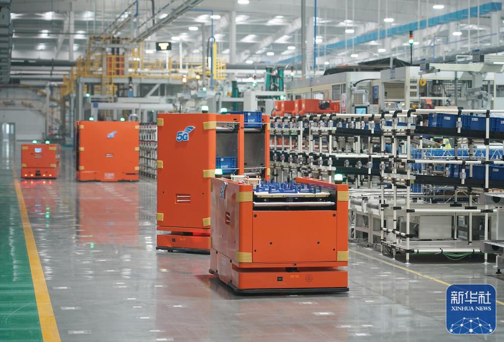 11月9日,智能搬运机器人在位于西安高新区的法士特高智新工厂项目车间内运输物料。新华社记者 邵瑞 摄