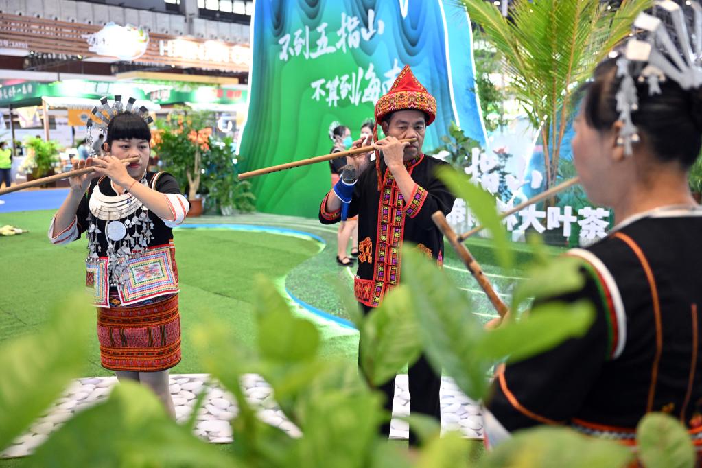 12月15日,工作人员在2022年冬交会上演奏海南黎族传统乐器。新华社记者 郭程 摄