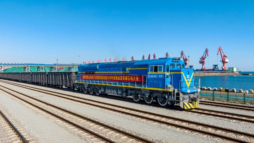12月15日,随着满载8780吨电煤的列车抵港,山东港口日照港年度铁路货物拖运量首次突破亿吨大关。新华社发(张明军摄)