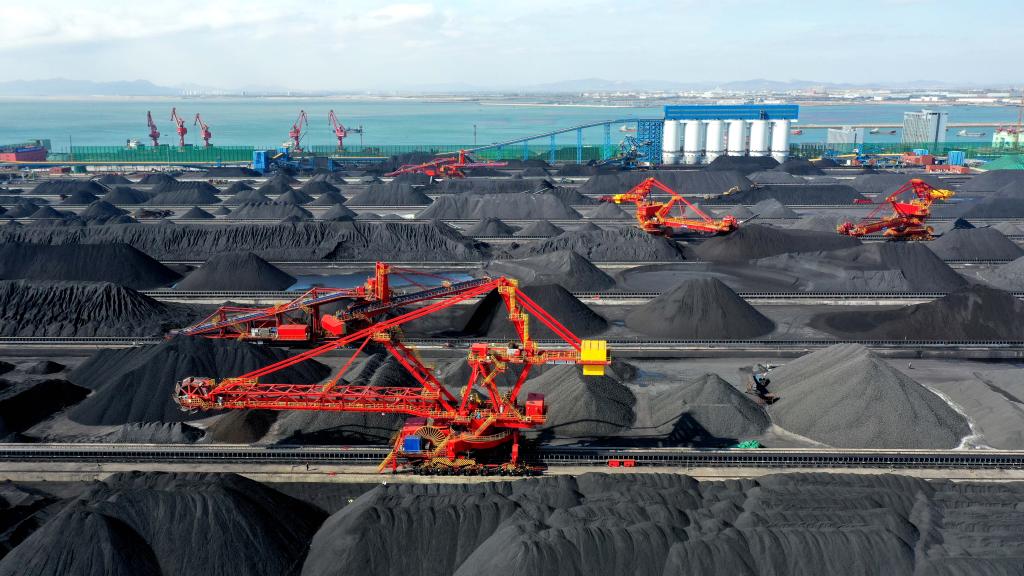 在山东港口日照港大宗干散货智慧绿色示范作业区,堆取料机忙碌堆取煤炭。(新华社记者 郭绪雷摄)