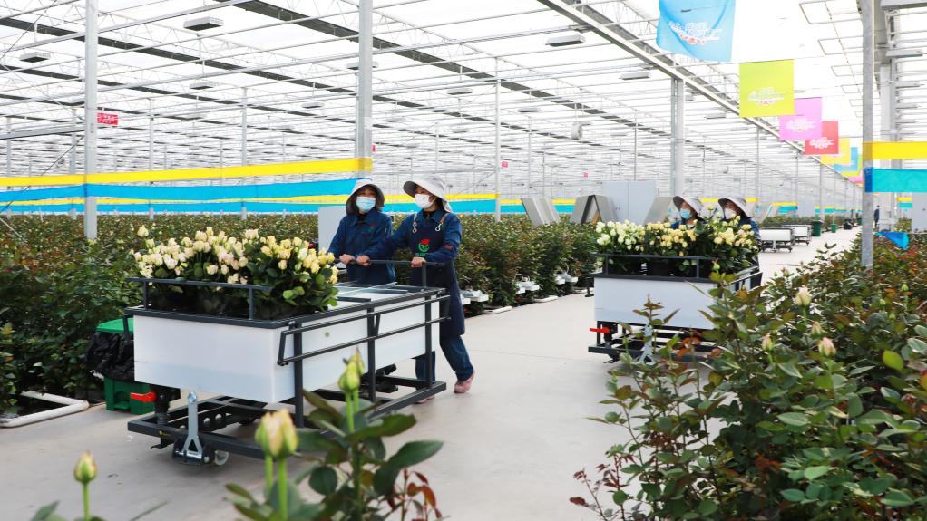 在位于甘肃省临夏市的百益亿农国际鲜花港,工人们正在搬运刚刚采摘的玫瑰。(受访单位供图)