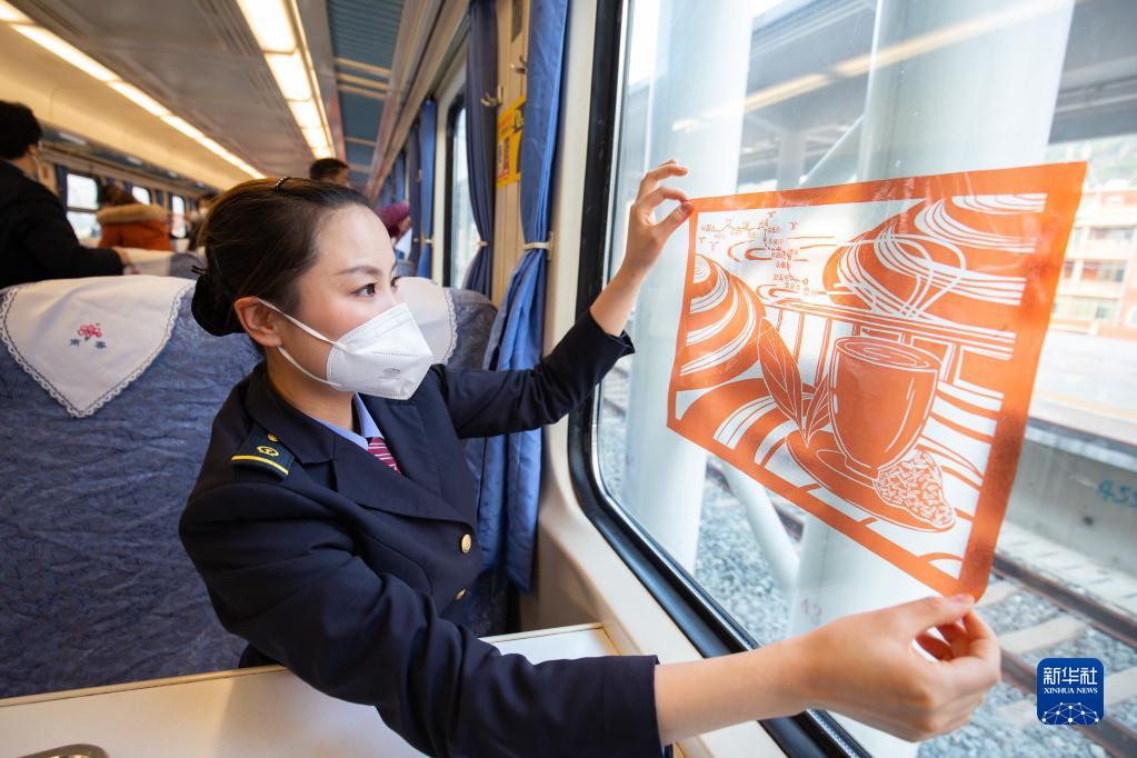 12月30日,在福建泉州站,T8010次列车乘务员在车内布置。新华社记者 周义 摄
