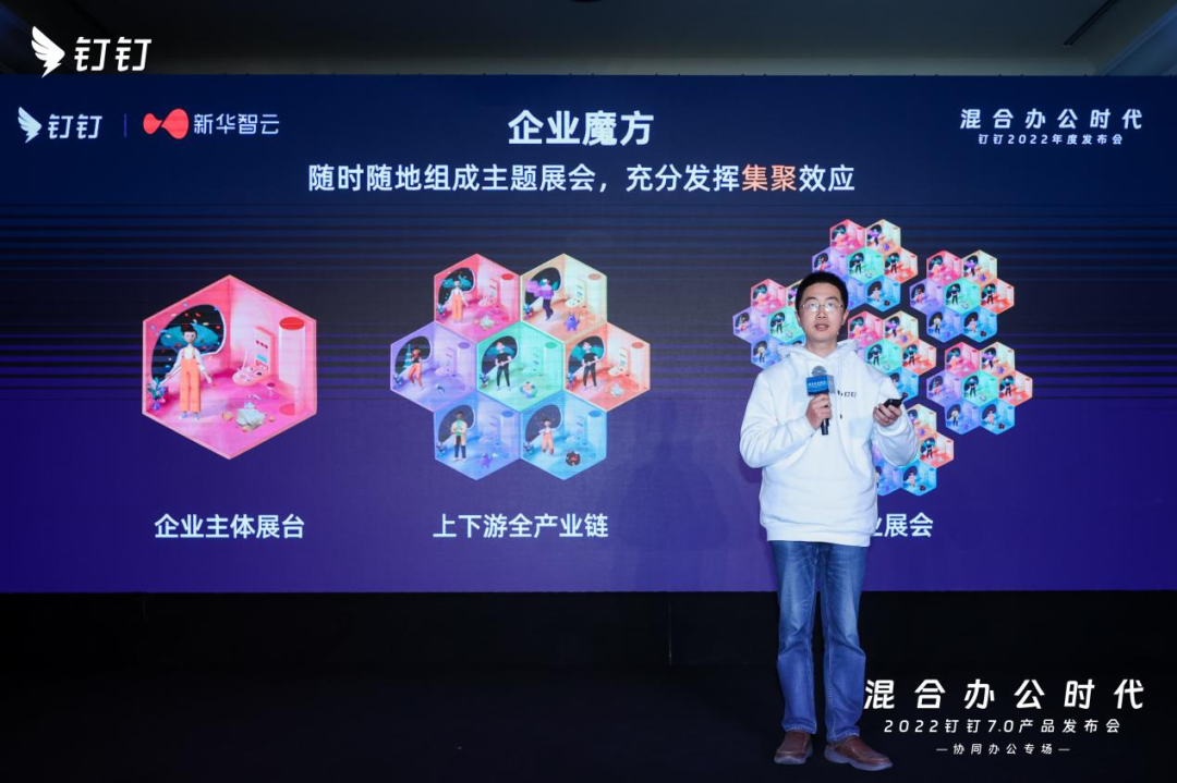 12月28日下午,在“钉钉7.0产品发布会”协同办公分论坛上,新华智云与钉钉宣布联合推出一款“企业魔方”数字会展新产品,可实现快速、低成本、个性化搭建企业的元宇宙活动展厅,打破传统会展中的时间和空间限制。用户在钉钉小程序里就可以直接打开这款Web3D应用,无需下载任何APP,通过拖拉拽选择模块就能轻松完成整个展厅的搭建、链接和访问,随时随地云上看展。
