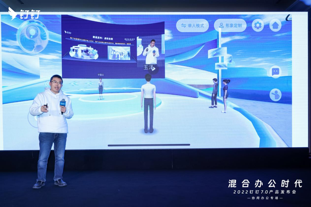 在发布会现场,林锋不仅展示了云端1:1复刻的钉钉展馆,包括钉钉的众多生态企业展馆如罗技、魔点、EPO、科益侬食堂、明我、斗拱云、维小宝、rokid、Nreal和新华智云等,这些企业展馆聚合在一起,就是钉钉生态企业云端展会。现场观众扫码即可以数字游客身份体验,不仅能根据喜好更换造型,还能和其他数字人进行交流。