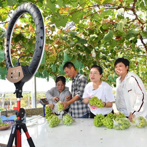 2022年8月9日,在福建省福安市赛岐镇象环村的葡萄种植园,工作人员直播推销葡萄。新华社记者 姜克红 摄