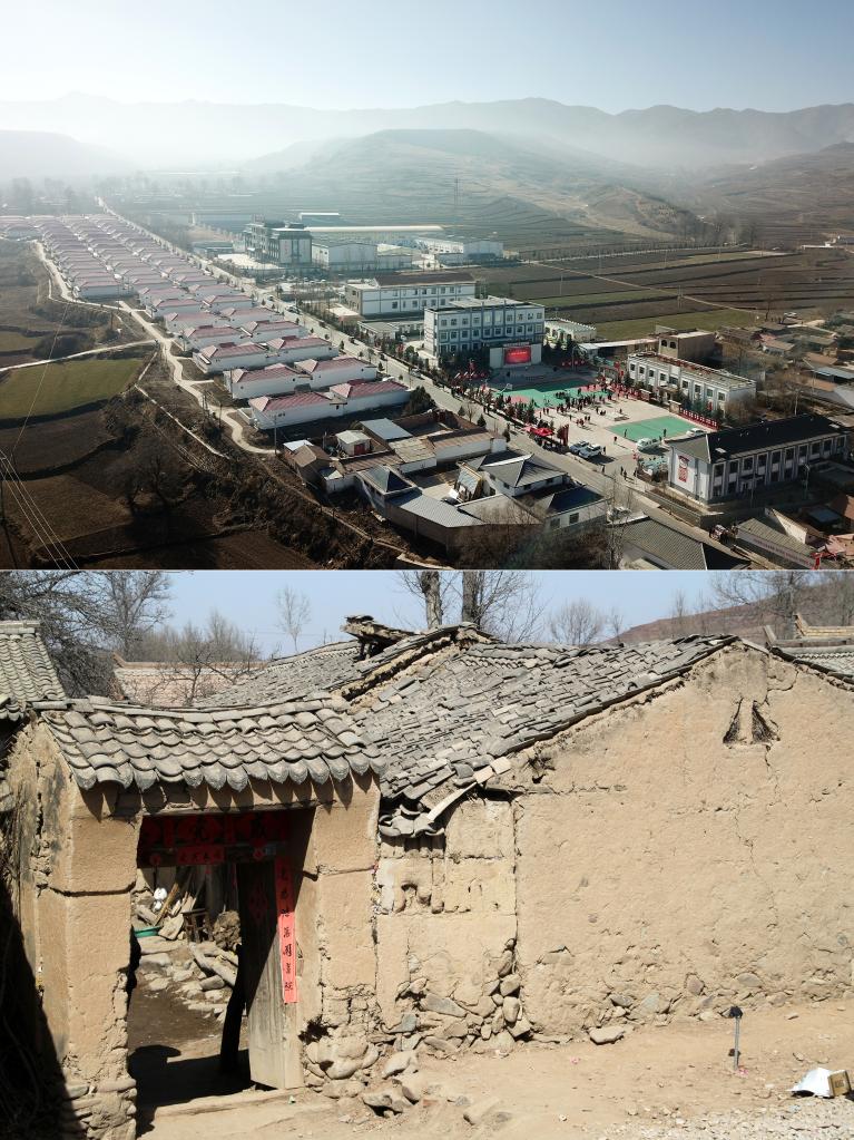 这是一张拼版照片。上图为2023年1月10日拍摄的渭源县田家河乡元古堆村景象(新华社记者范培珅 摄);下图为2013年3月拍摄的脱贫前元古堆村的一处民居(资料图片)。