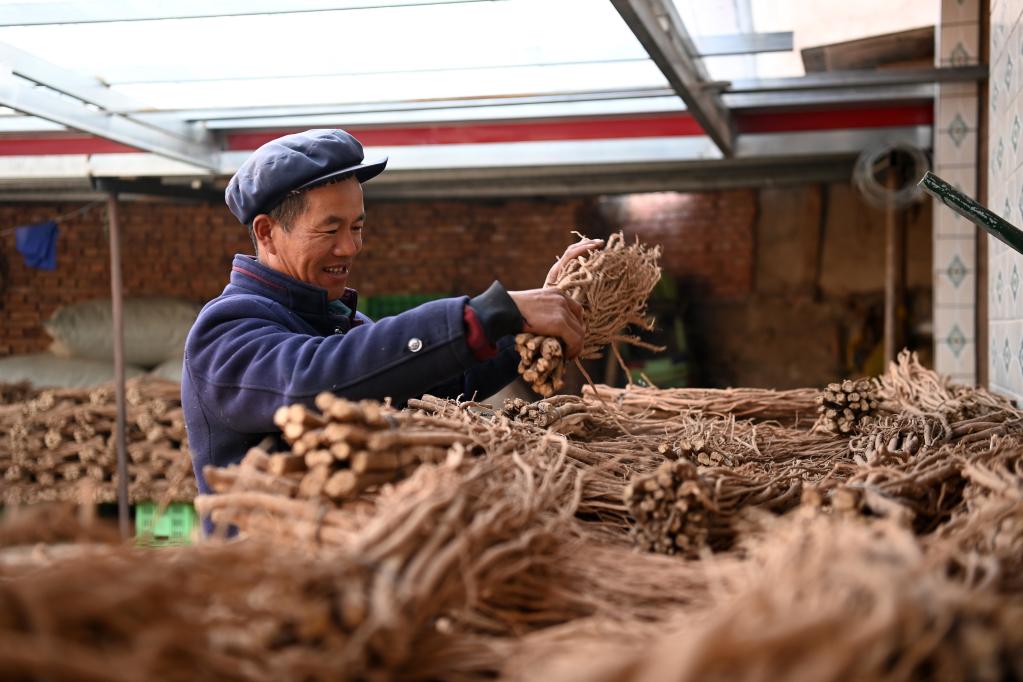 1月10日,在渭源县田家河乡元古堆村,曾玉成整理家中存放的中药材。新华社记者范培珅 摄