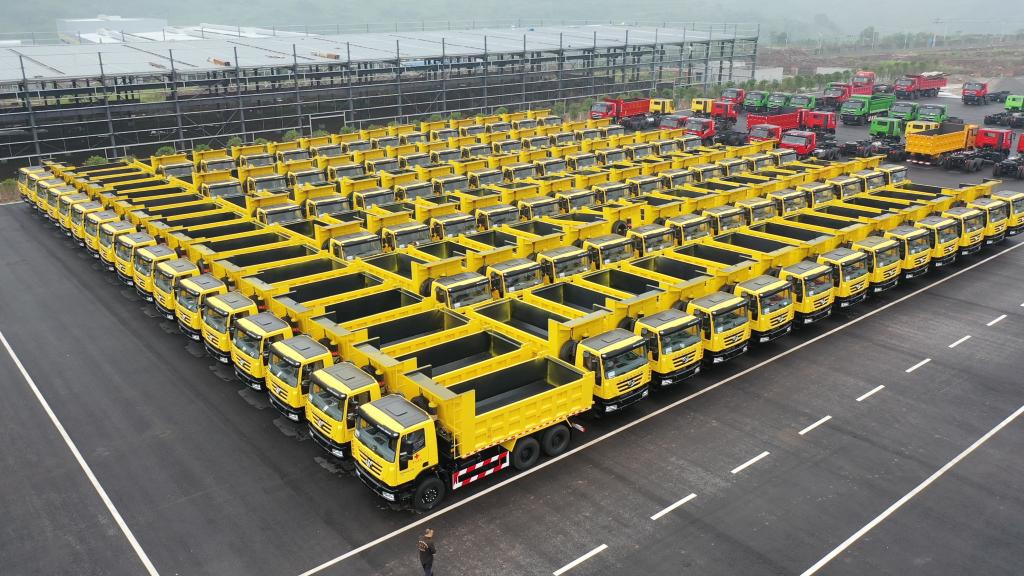 上汽红岩生产的一批车辆正整装待发,准备出口至国外市场。(受访者供图)