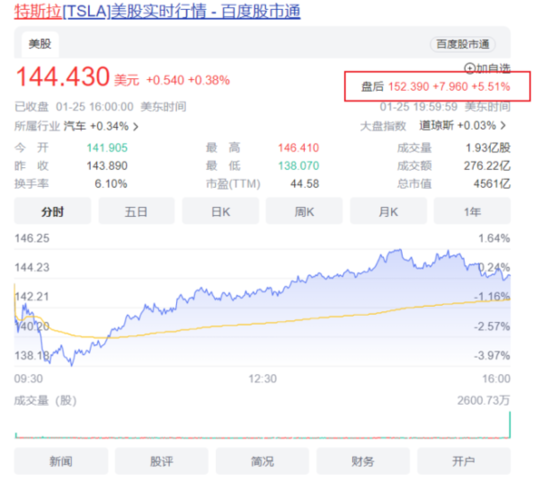 财报数据公布后,特斯拉股价盘后涨超5%。