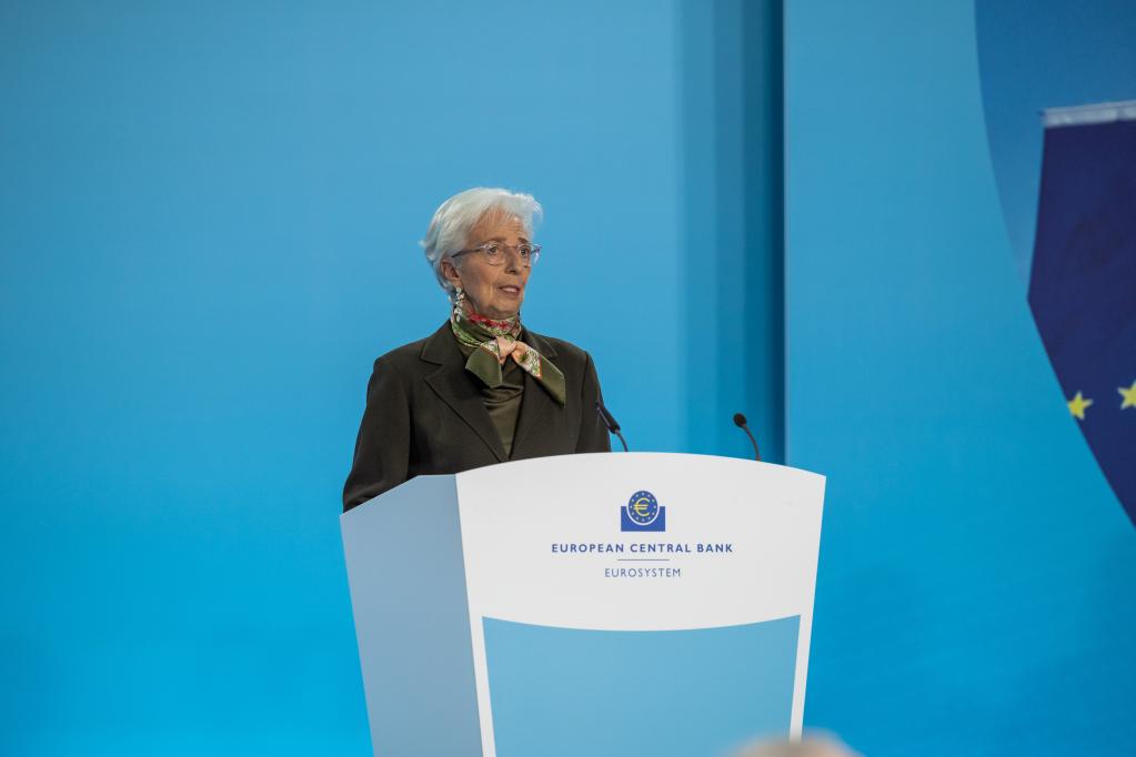 2023年2月2日,在位于德国法兰克福的欧洲央行总部,欧洲中央银行行长拉加德在新闻发布会上讲话。(新华社发,欧洲央行供图)
