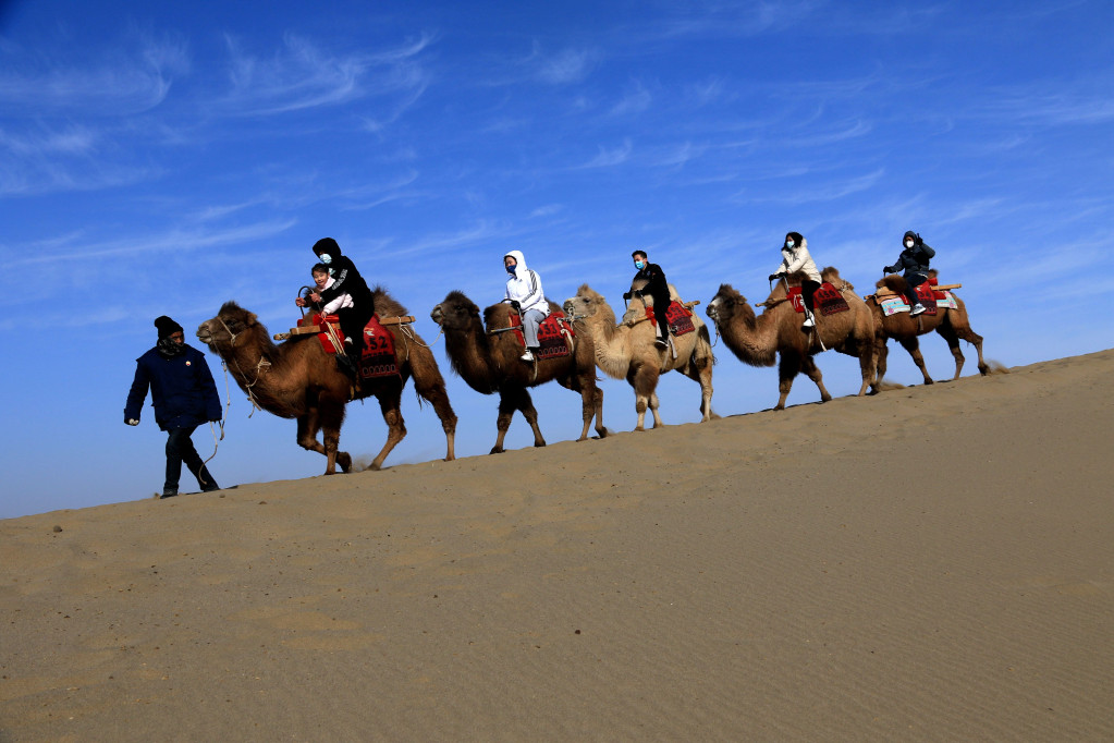 1月27日,游客在甘肃省敦煌市鸣沙山月牙泉景区骑骆驼游览。(新华社发 张晓亮 摄)