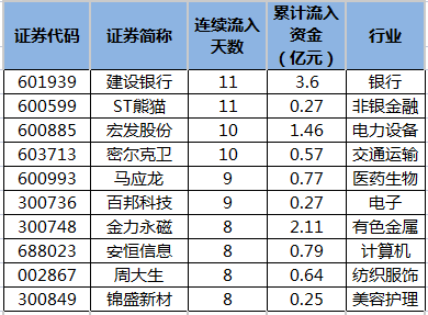 截至2月16日收盘,沪深两市共58只个股连续5日或5日以上主力资金净流入。连续流入天数最多的是ST熊猫、建设银行,均已连续11个交易日净流入。连续净流入天数较多的还有宏发股份、密尔克卫、马应龙、百邦科技、金力永磁,分别获10个、10个、9个、9个、8个交易日净流入。