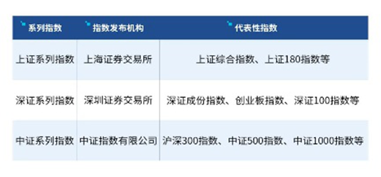 在我国,证券类指数主要由证券交易所和指数公司这两类机构发布。以我国三大指数系列为例,上证系列指数和深证系列指数都属于证券交易所编制的系列指数,中证系列指数则是由中证指数有限公司编制。
