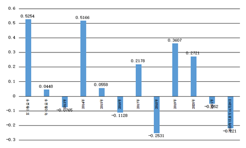 第一,绝对收益率。累计收益率、年度收益率、年化收益率都是直接了解指数在一段时间内涨跌幅的主要指标。其中,累计收益率和年度收益率比较直观好理解;年化收益率则是把区间累计收益率换算成以年为单位、以复利计算的方式推导、每年能带来的收益,但这只是一个换算值,并不代表每年实际收益。以沪深300价格指数为例,截至11月29日,2013年以来的近10年,累计收益率为52.54%,年化收益率为4.48%,但这期间各年度收益率分化也较大(见下图)。