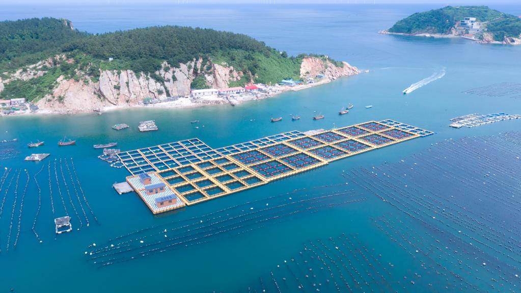 在黄海深处的大连市长海县,马达声中,渔民驾着小船,带着记者驶向深海。黛蓝色的海面上,浮筏和网箱一字排开,看不到边际。这些密布的网箱是当地海洋牧场中的智能化深海鱼类生态养殖网。