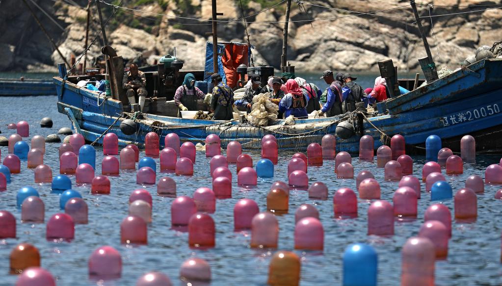 大连市长海县海洋岛镇的渔民在海洋牧场上作业。新华社记者姚剑锋 摄