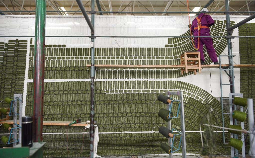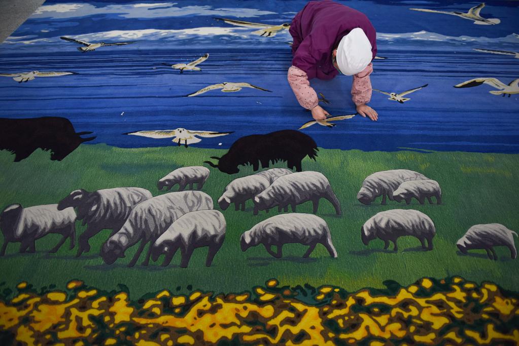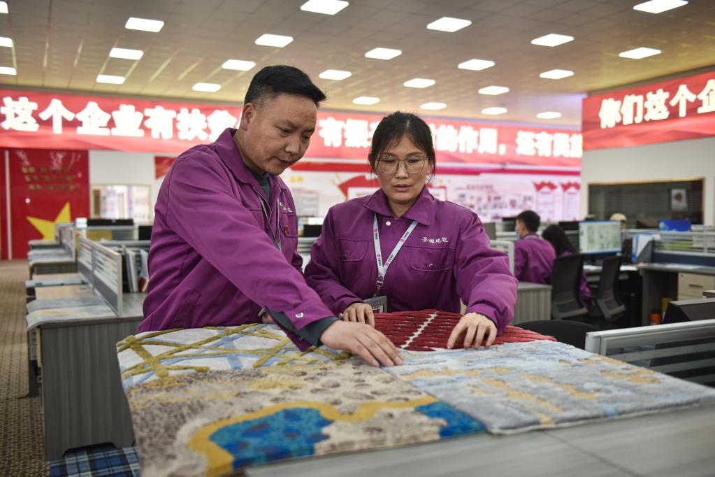 2月21日,在圣源地毯集团有限公司生产车间,操作工检查毯面、拔花刺。新华社记者 吴刚 摄
