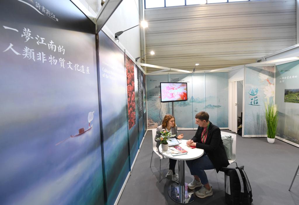3月7日,参观者(右)在德国柏林举行的柏林国际旅游交易会中国浙江展区与工作人员交流。(新华社记者任鹏飞摄)