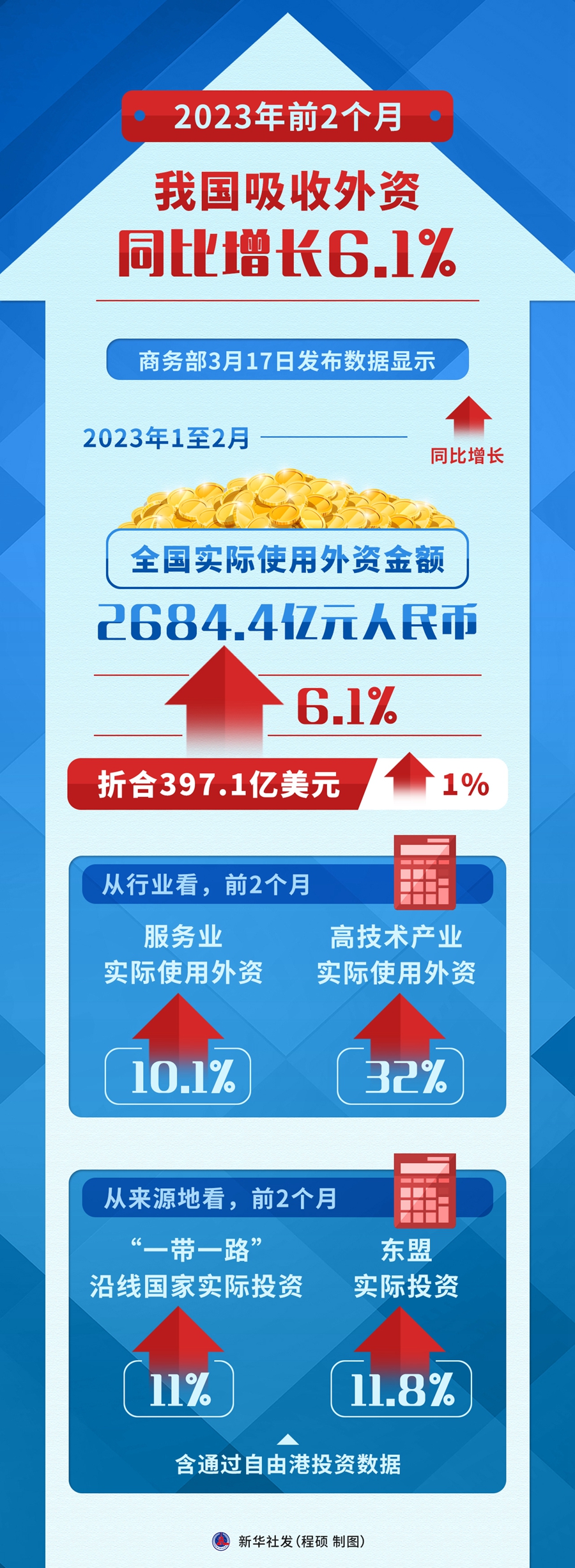 新华社北京3月17日电(记者谢希瑶)商务部17日发布数据显示,2023年1至2月,全国实际使用外资金额2684.4亿元人民币,同比增长6.1%,折合397.1亿美元,同比增长1%。