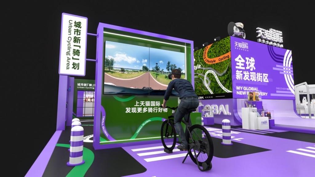 进口零售平台天猫国际是连续第三年参展,紧跟年轻人热衷潮流运动消费的新趋势,上届展会打造了陆地冲浪板体验区,本届展会根据“城市骑行”热潮布置了VR骑行互动区。